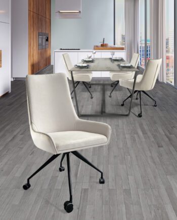 Silla DIANE CON RUEDAS tapizada blanca con pespuntes gris y patas negro mate Schuller