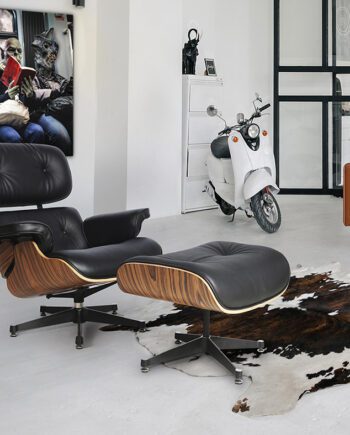 Sillón Chaise Longue EAMES con reposapiés madera y tapizado en piel negra con patas de aluminio negro Schuller