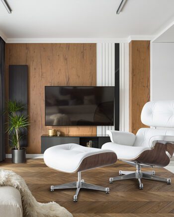 Sillón Chaise Longue con reposapiés EAMES madera nogal y tapizado en piel blanca con patas aluminio Schuller
