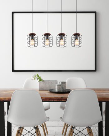 Lámpara en línea ELMAR negra con cuatro colgantes y detalle madera