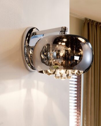 Una barra de metal negro mate con un saliente de 15 cm va desde un soporte de pared rectangular hasta un casquillo E27, que está encerrado en una pantalla de cristal cilíndrica de color ahumado con adornos de cristal.