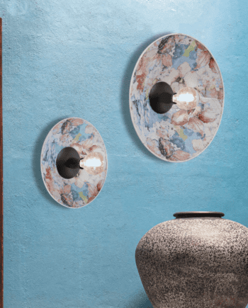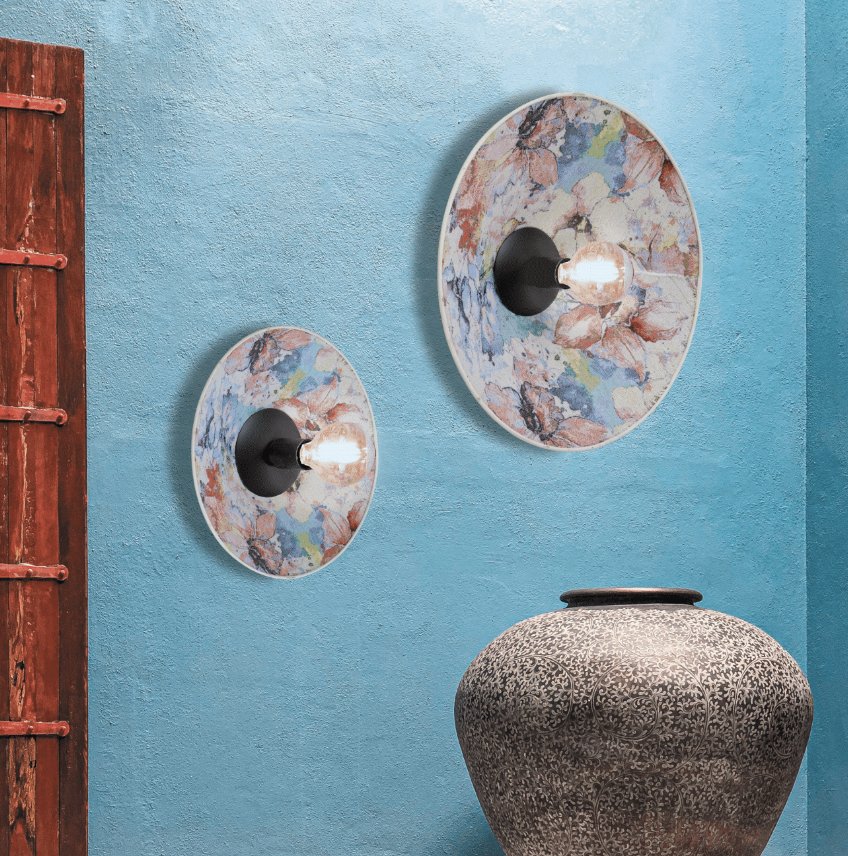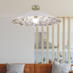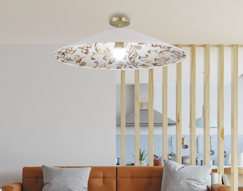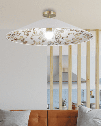 Lámpara de pantalla redonda en semi plafón, apto y preciosa como aplique de pared.