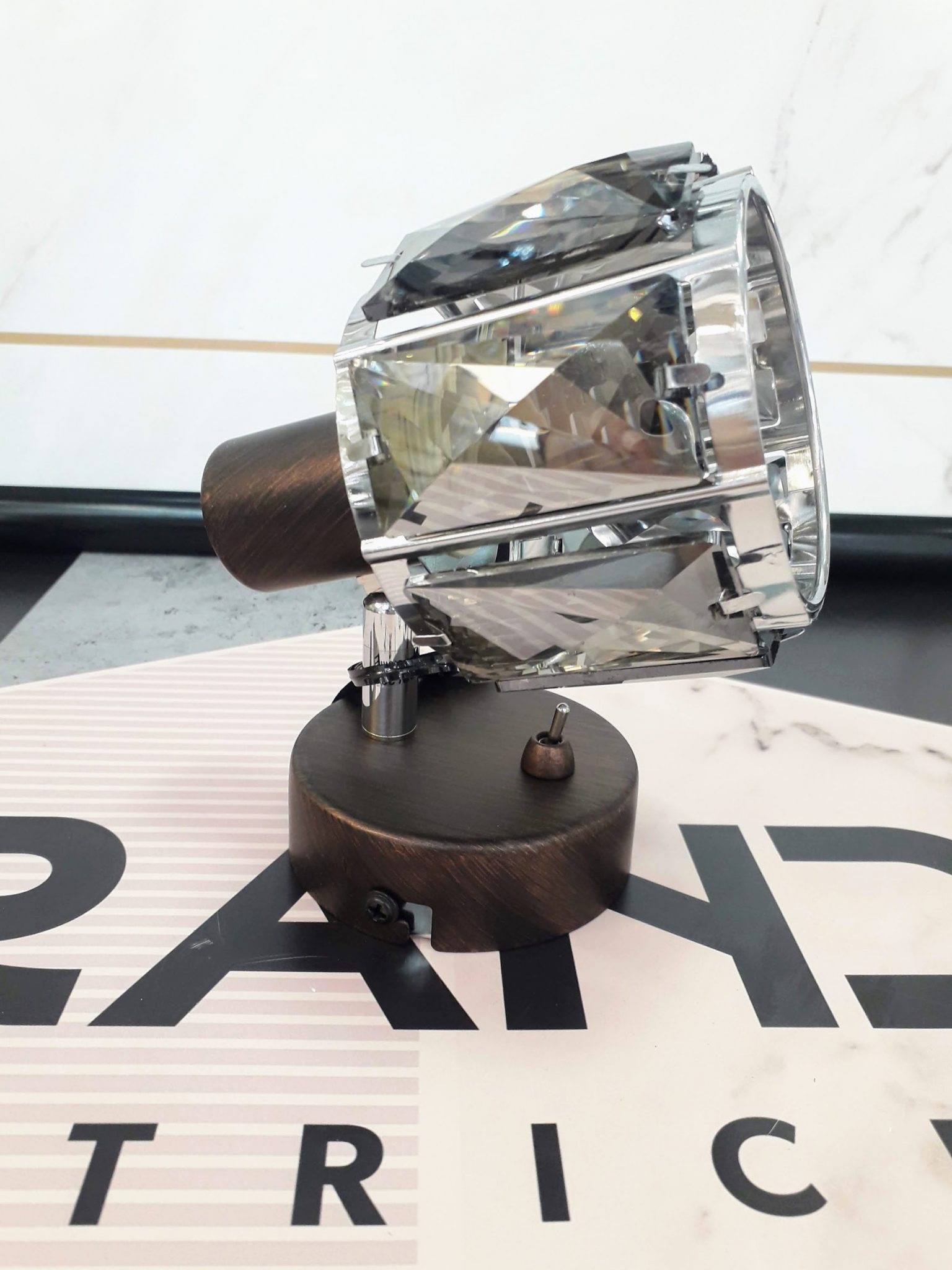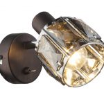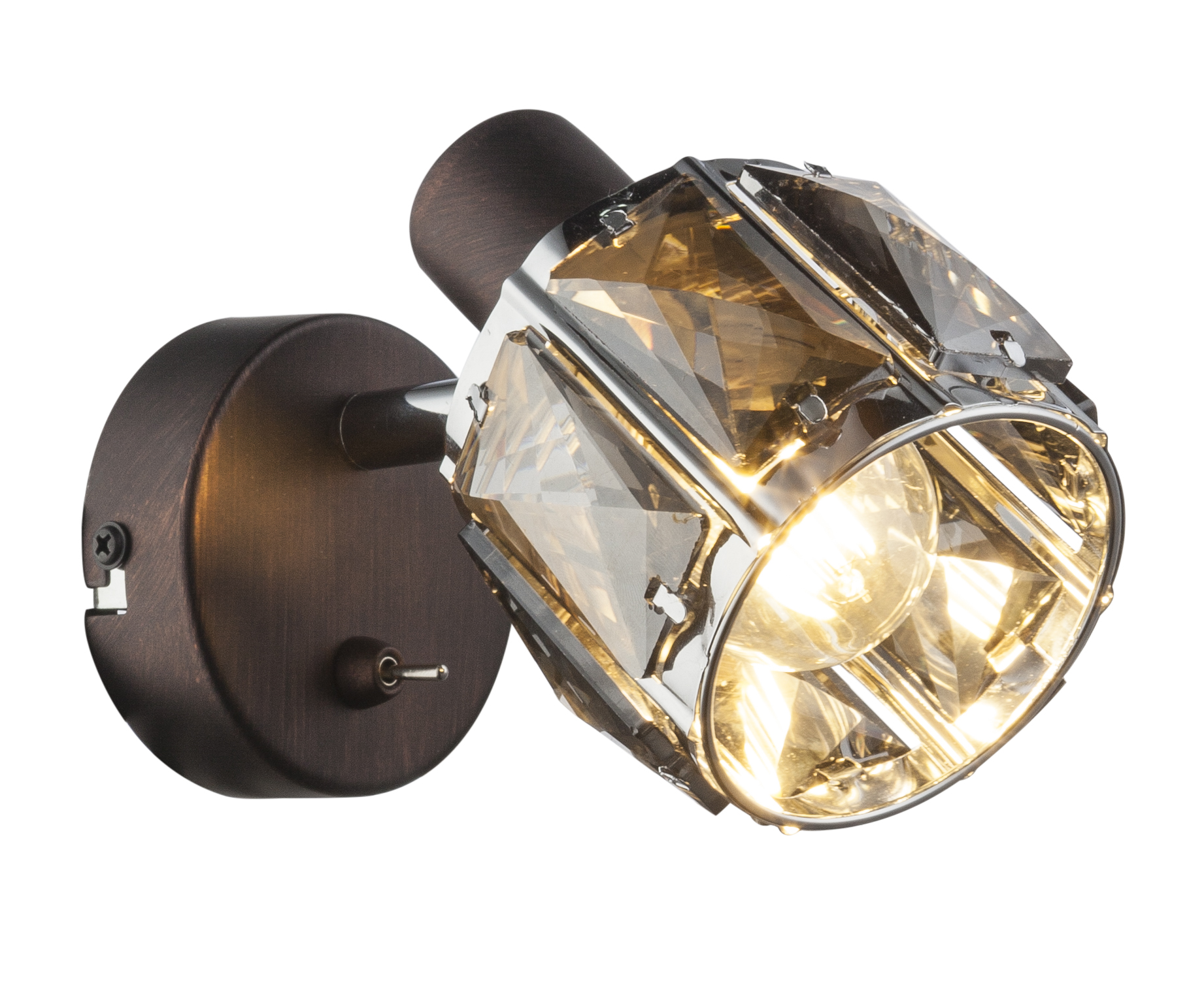 La placa de pared marrón envejecido de esta lámpara de pared, equipada con un interruptor, lleva un elegante foco móvil hecho de preciosos cristales de vidrio en color ámbar caramelo.