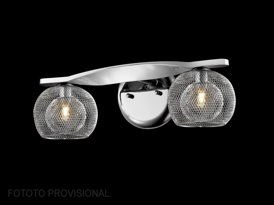 Lámpara de pared de 2 luces, realizada en metal cromado. Tulipa de doble esfera de malla metálica.