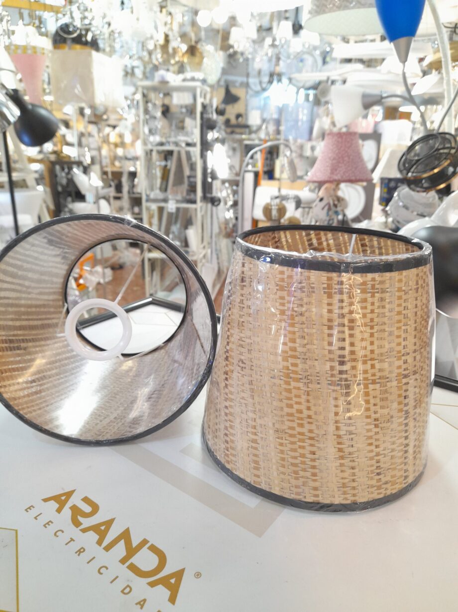 BANANA: Pantalla tela trama oscura, vivo negro, Marinisa. 20cm diámetro en E27, forma normal alta. DISPONIBLES EN TIENDA