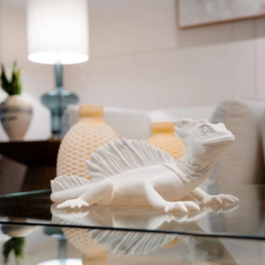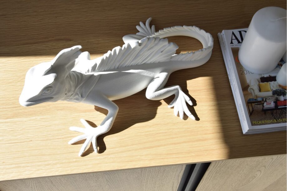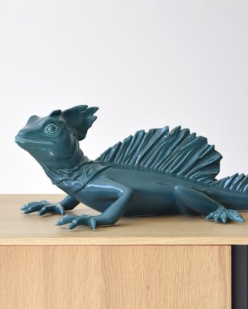 SE TRATA DE LA ESCULTURA DEL LAGARTO BASILISCO VERDE CARACTERÍSTICO POR SU DOBLE CRESTA EN CABEZA Y CUERPO.