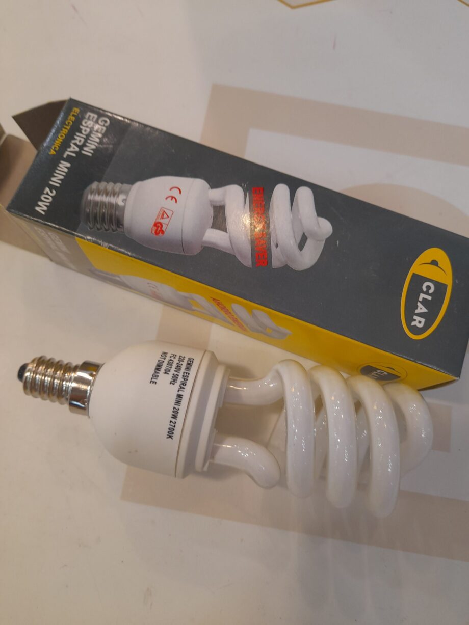 Bombilla bajo consumo, diseño rizo espiral en E14, 20w luz cálida 2700k, Gemini Clar. STOCK DISPONIBLE EN TIENDA
