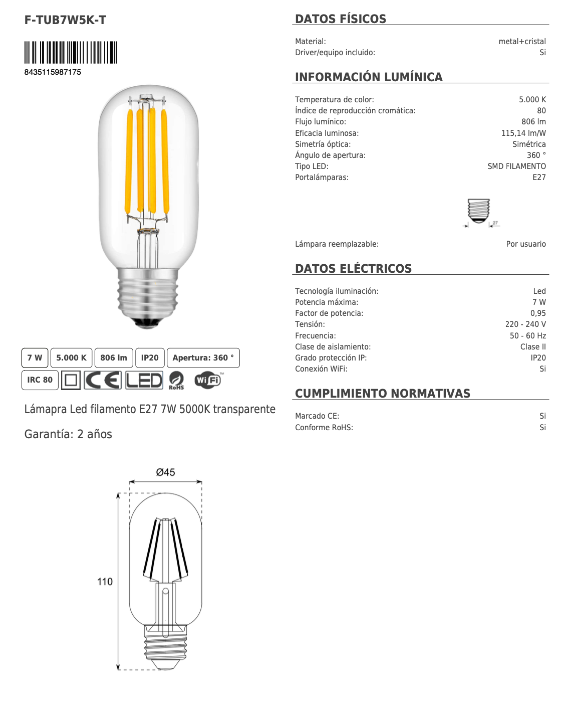 Cristal incoloro, filamento interior de led. 806 lm. 5000 K. Haz de luz de 360°.