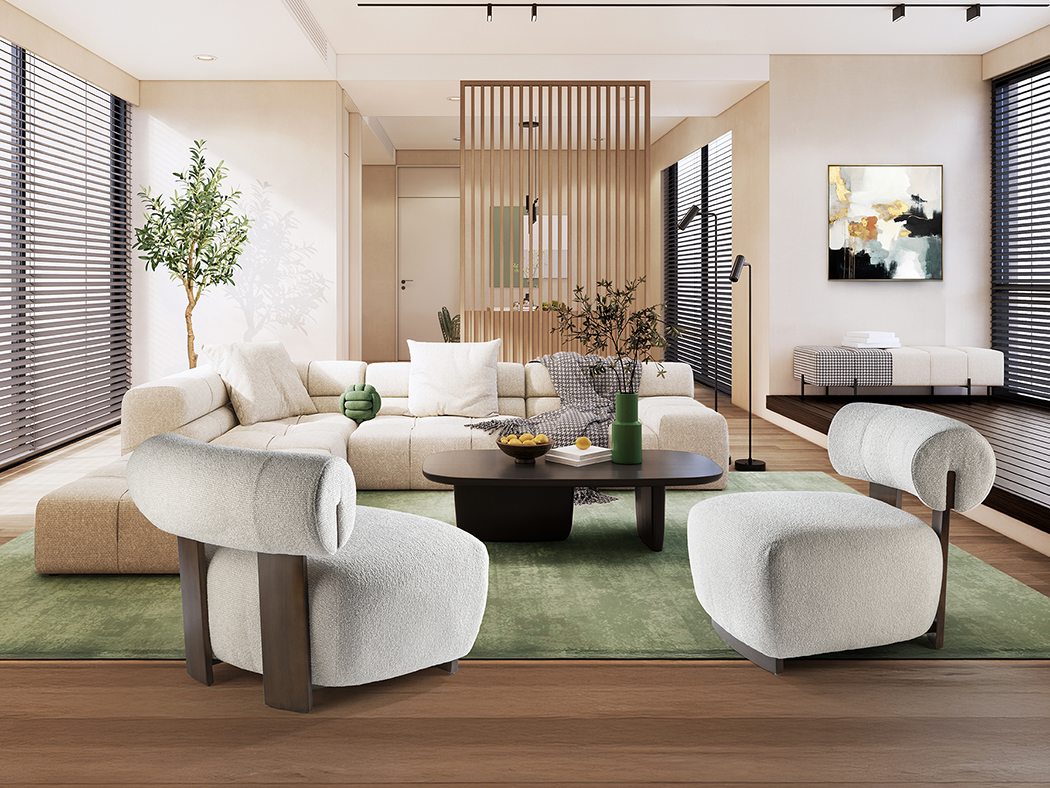 Butaca NAOMI tapizada en chenilla crudo con madera negra Schuller