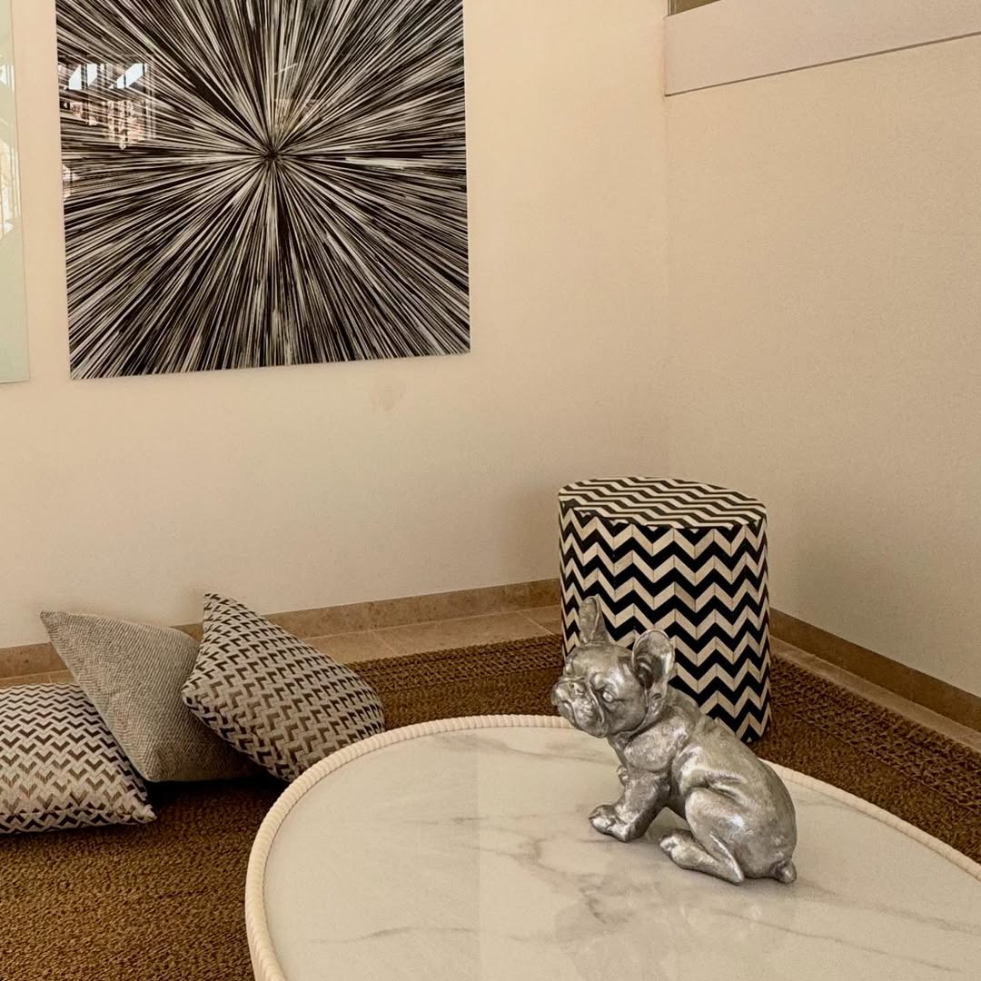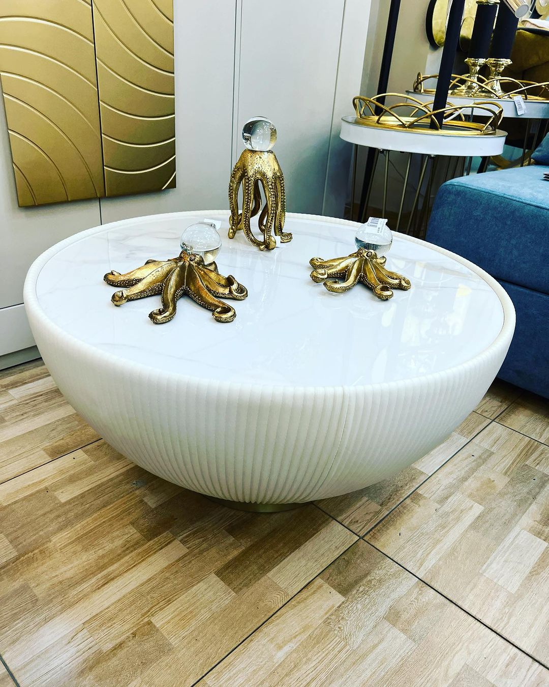 Mesa centro redonda, tapizada en polipiel plisada de color blanco, base metálica acabado latón y tapa de piedra sinterizada imitación mármol blanco.