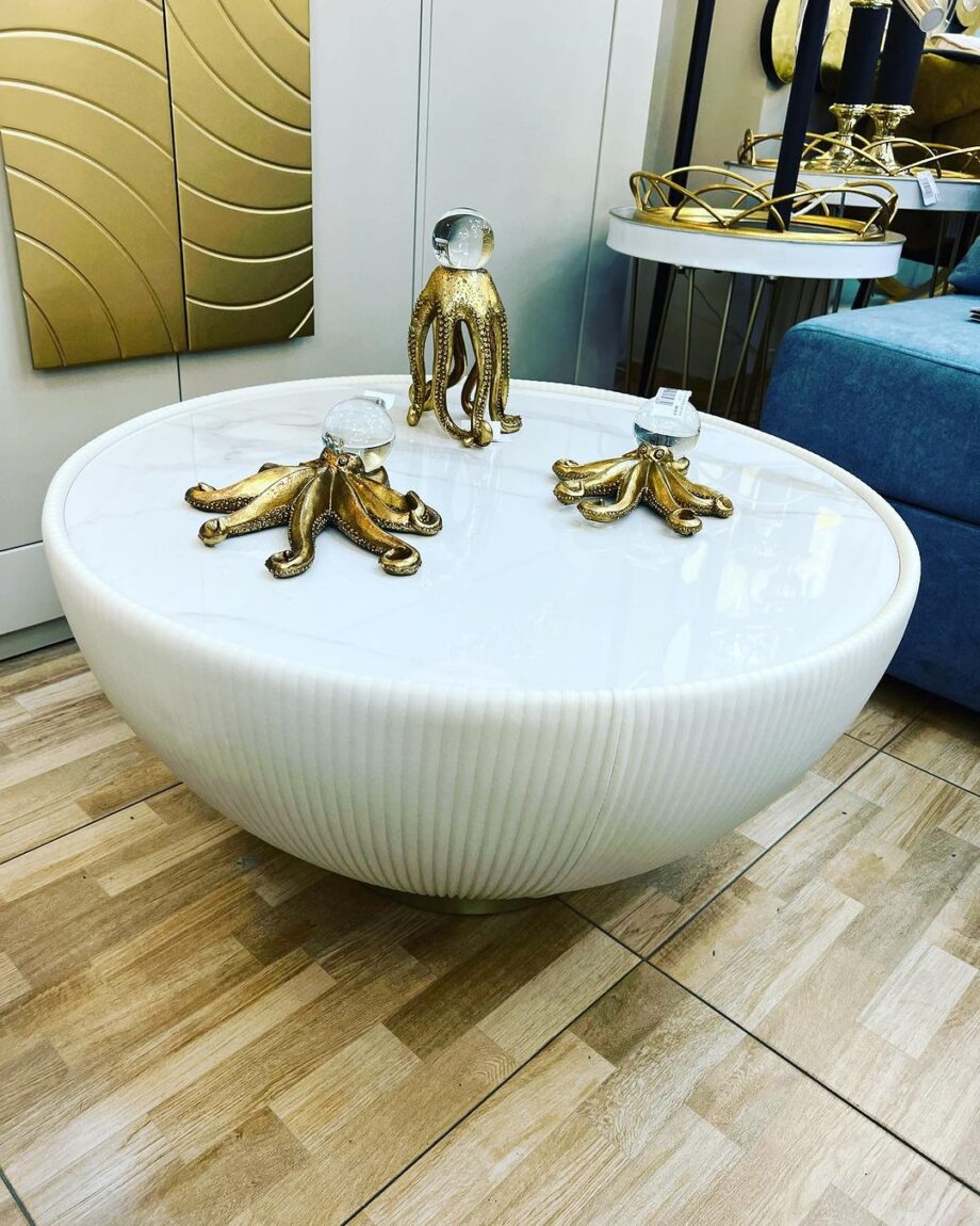 CANDY – Mesa de centro tapizada en polipiel blanco y base latón grande Ø72cm