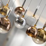 Tulipas de cristal con baño electrolítico en tonos latón antiguo, ámbar, plata y transparente, con luz LED y difusor de acrílico opal.