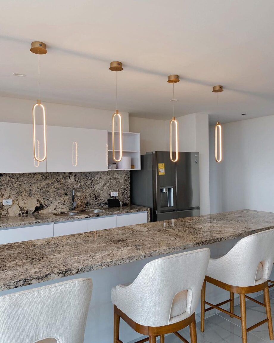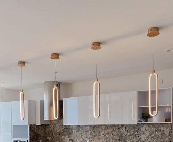Lámpara colgante LED, realizada en aluminio en acabado dorado.