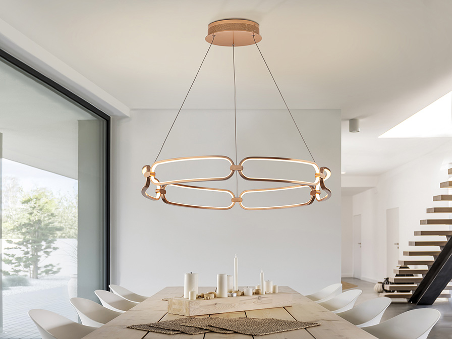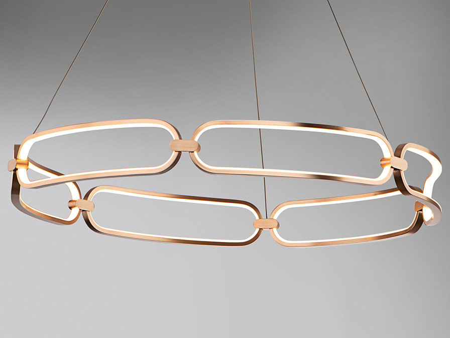 Lámpara LED grande, realizada en aluminio cepillado, acabado oro rosa.