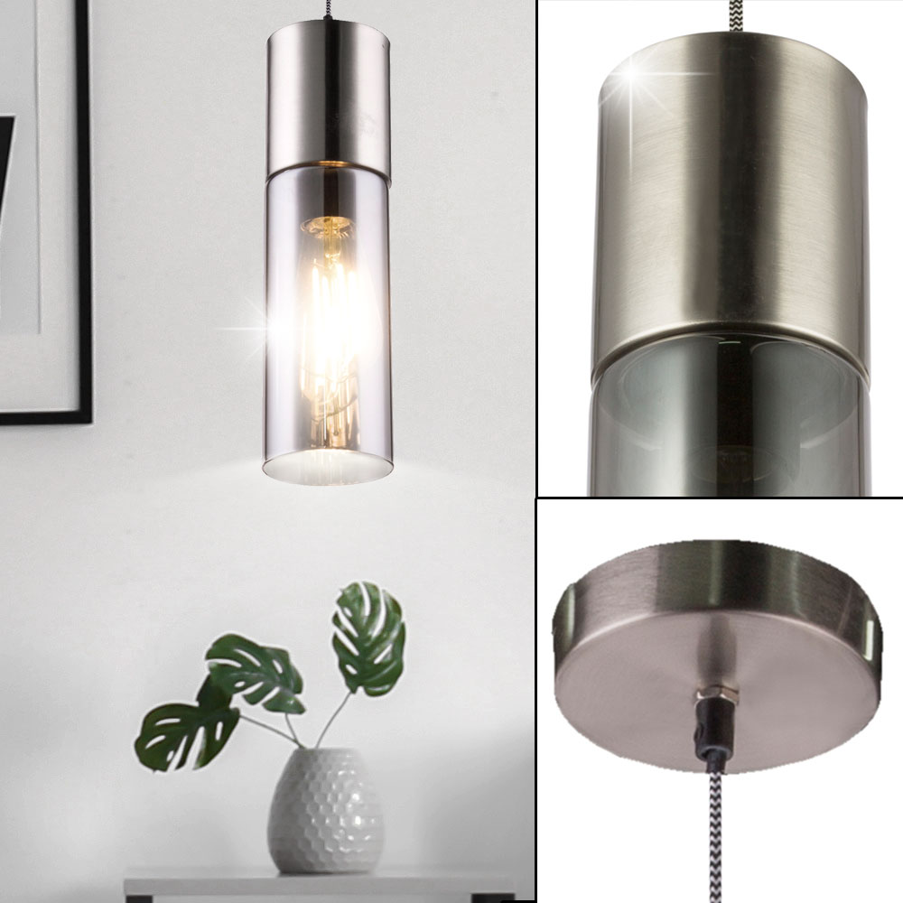 La lámpara colgante de níquel mate Annika es una iluminación atractiva en las salas de estar modernas. La suspensión de 150 cm de largo está unida a un pequeño soporte de techo redondo. La elegante y estrecha pantalla cilíndrica de vidrio cuelga en el extremo inferior.