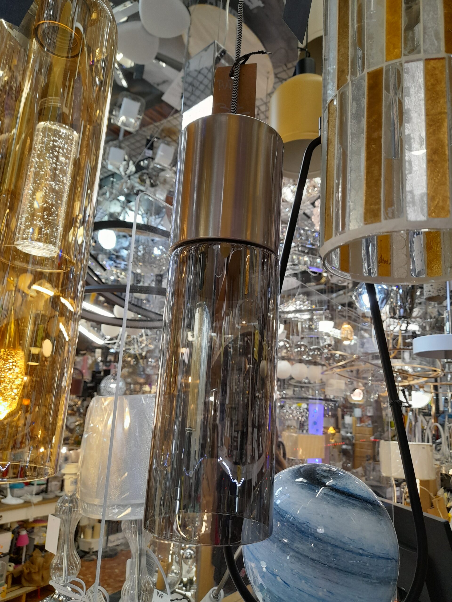 El cristal está ligeramente oscurecido y cuando enciende la lámpara, puede ver que la lámpara brilla a través de ella muy suavemente. La lámpara colgante se adapta perfectamente al estilo de mobiliario contemporáneo y se puede combinar fácilmente con otros productos de la serie.