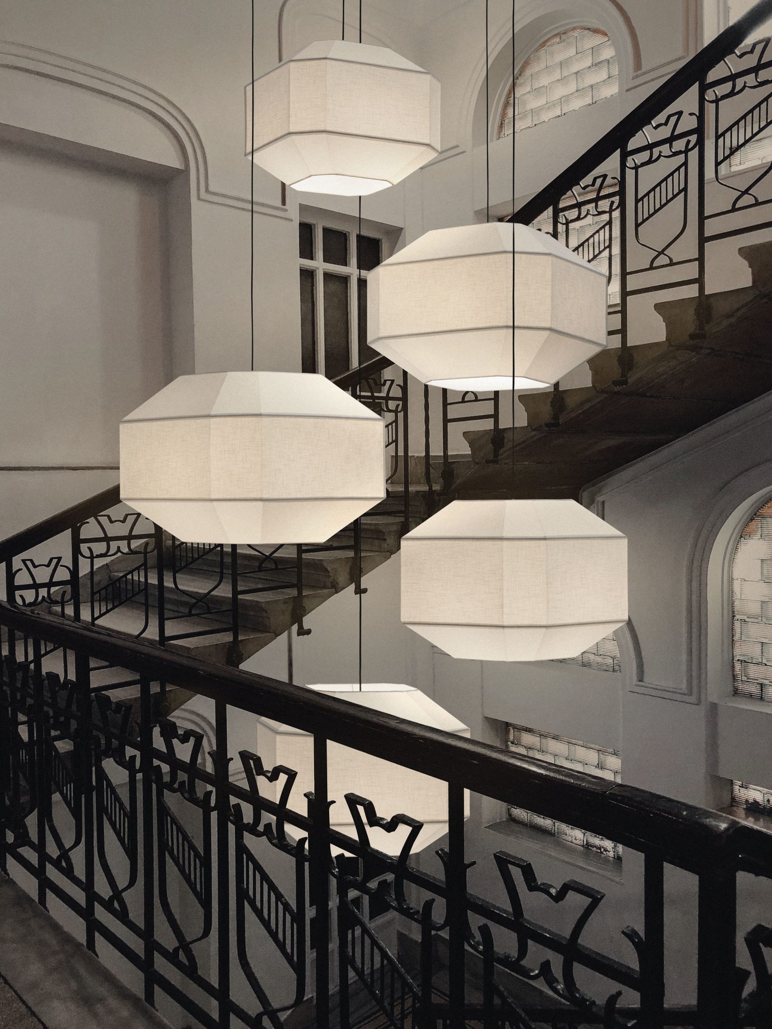 Precioso colgante geométrico de pantalla Lino beige / blanco, ideal para composiciones de varias piezas.
