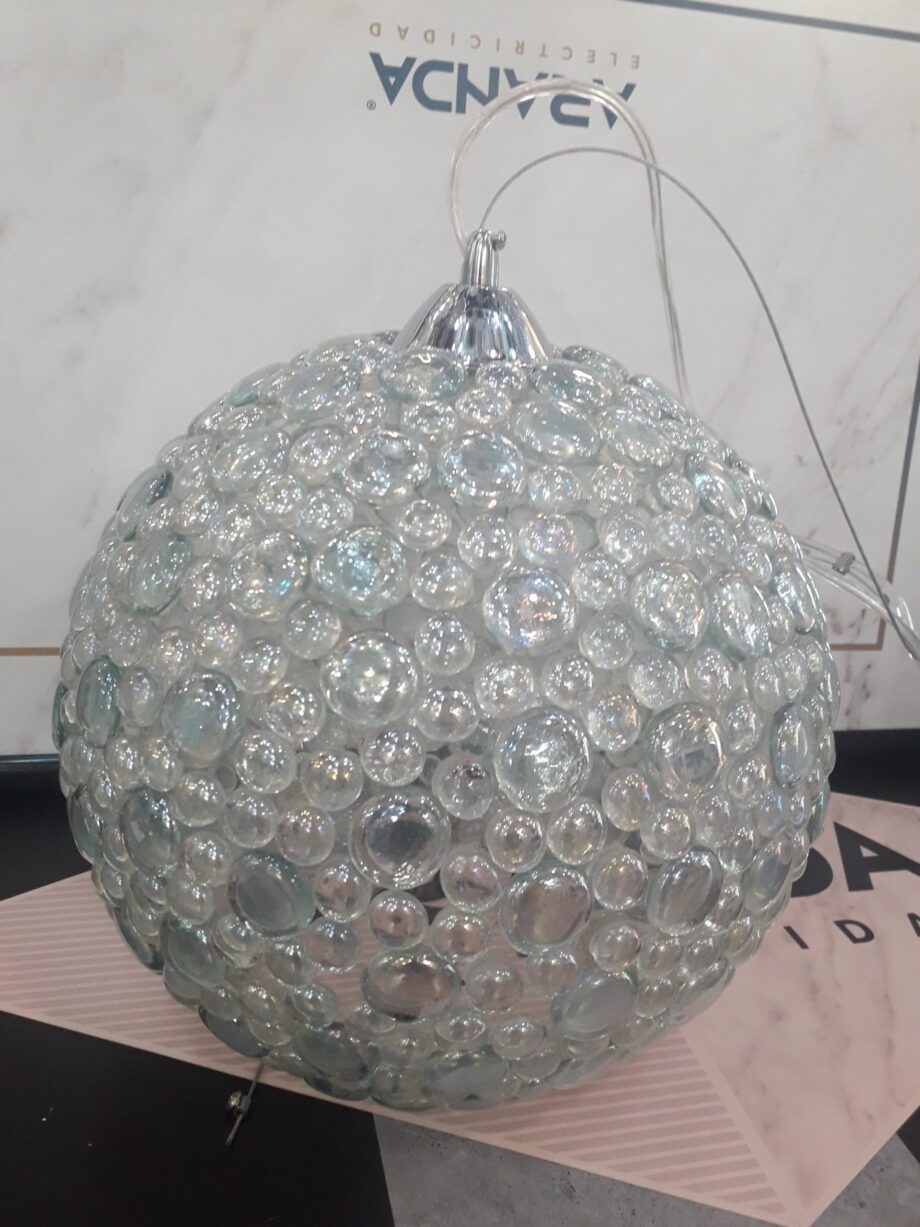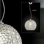 Lámpara de techo, suspendido colgante individual enfilaje cromo, con esfera de cristal transparente con piezas cristal superpuestas con un efecto estético original y único.