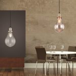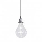 Lámpara de Techo Colgante de cristal transparente en forma de bombilla con 17 cm de diámetro. Enfilaje en níquel satinado y cable negro.