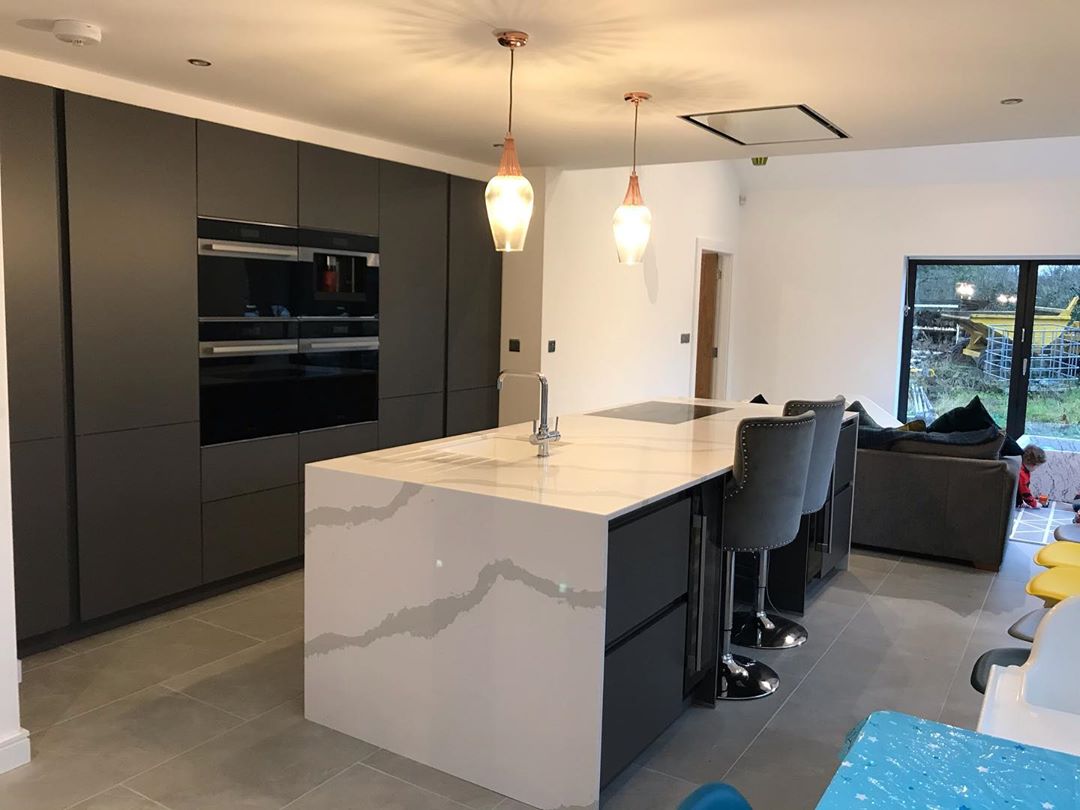 La pantalla de vidrio transparente tiene una elegante forma de pera al revés, con detalles de estilo batidor con acabado cromado en la parte superior y una suspensión de techo gris que se puede ajustar para diferentes alturas de techo.