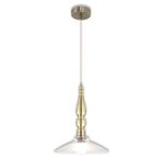 Colgante elegante en bronce con adorno, con tulipa de cristal transparente.