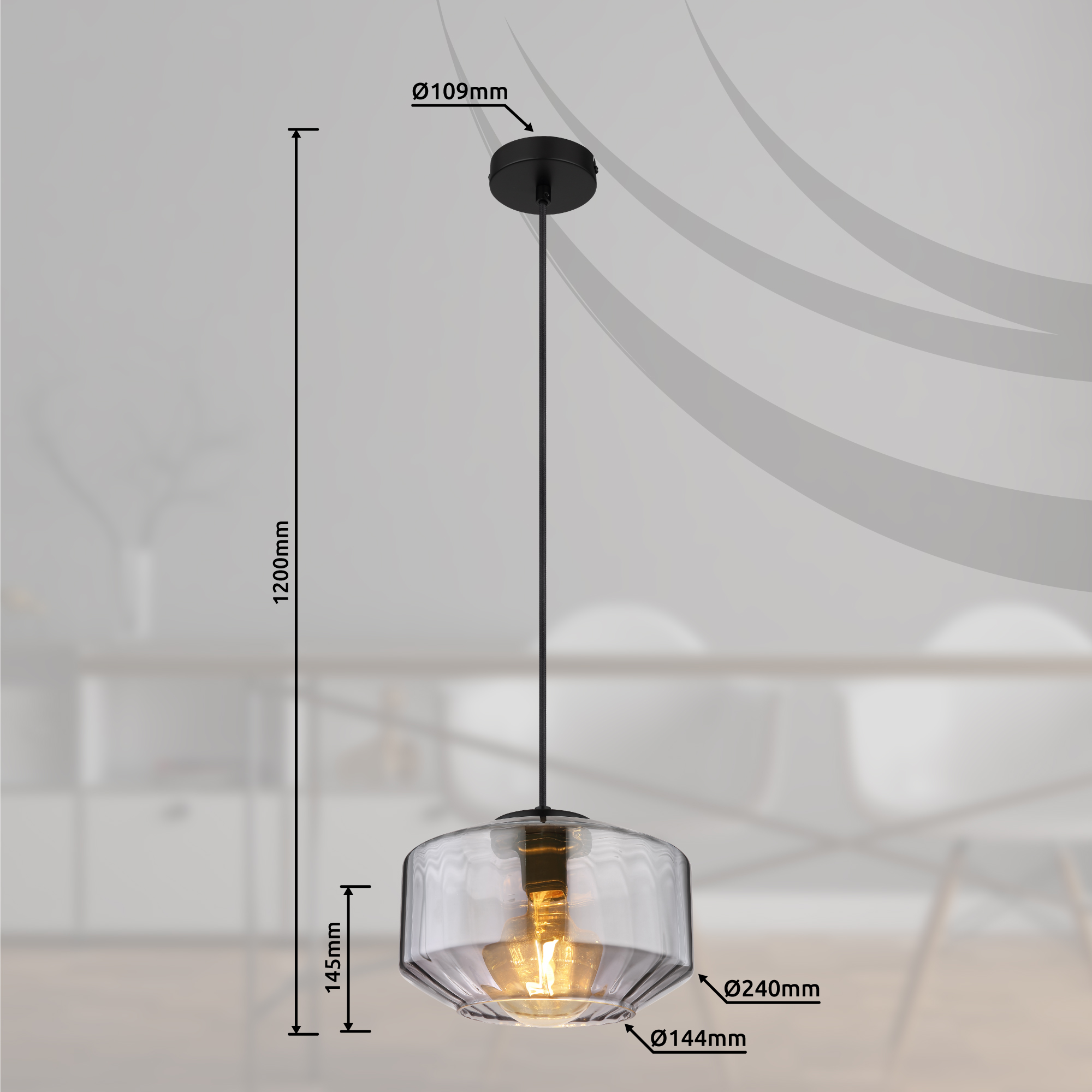 Un cable de 1,2 m de longitud sobresale de un soporte de techo redondo de color negro y termina en un casquillo E27 con una pantalla de cristal ahumado de forma elegante (Ø 24 cm).