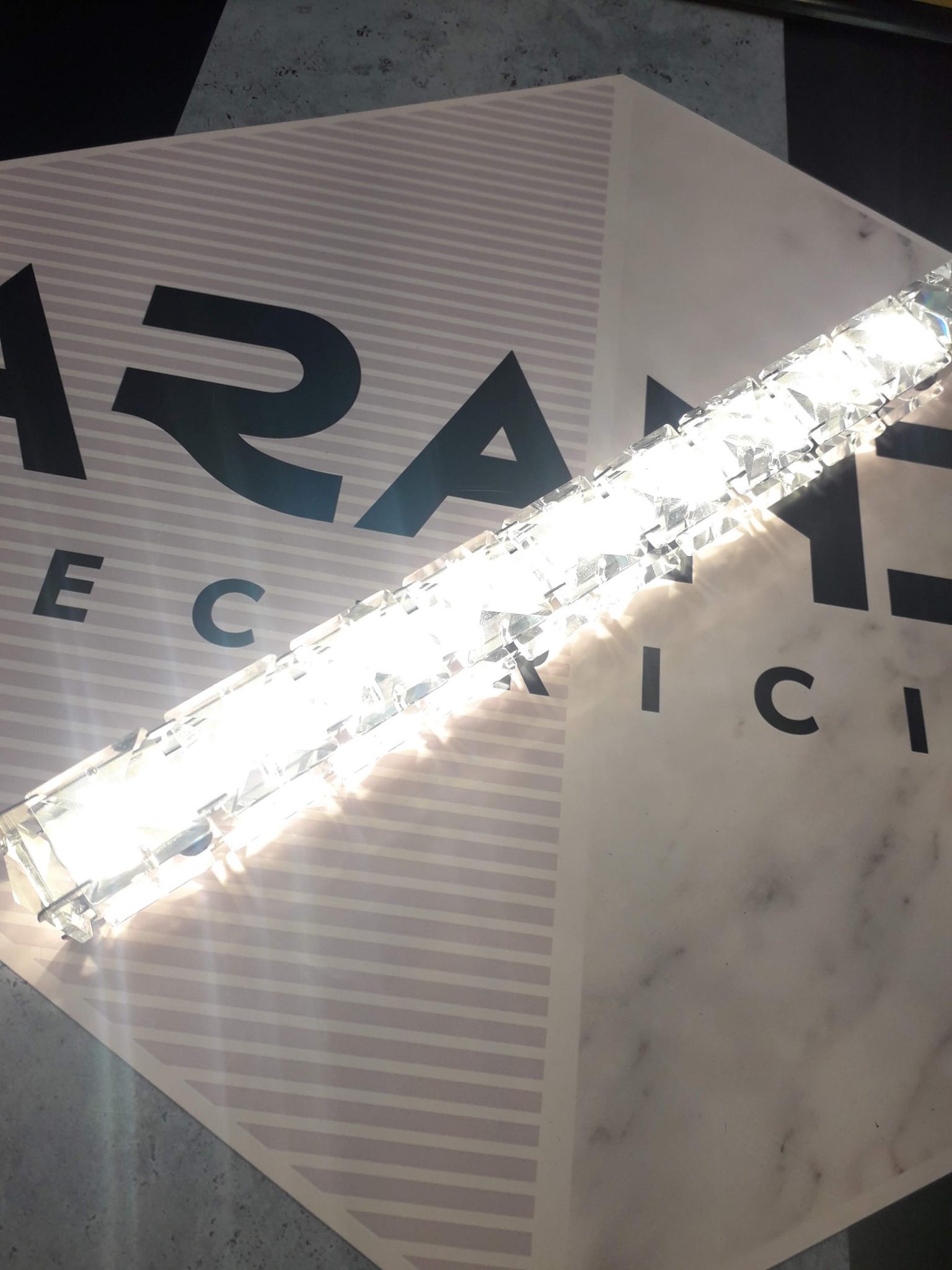 Forma de la columna, acabado cromado accesorio es adornado con Cristal brillante cuadrados con acabado de espejo y la última tecnología LED de ahorro de energía