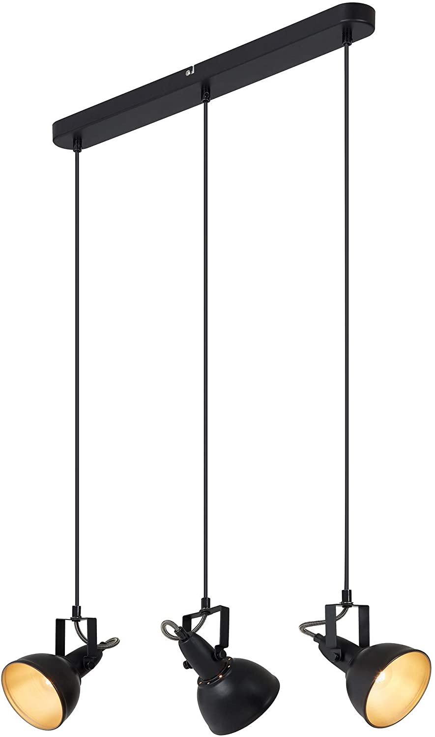 Lámpara de regleta negra con 3 Colgantes metálicos negro con interior dorado para 3 bombillas E14, 4049-035 Briloner. STOCK EN TIENDA