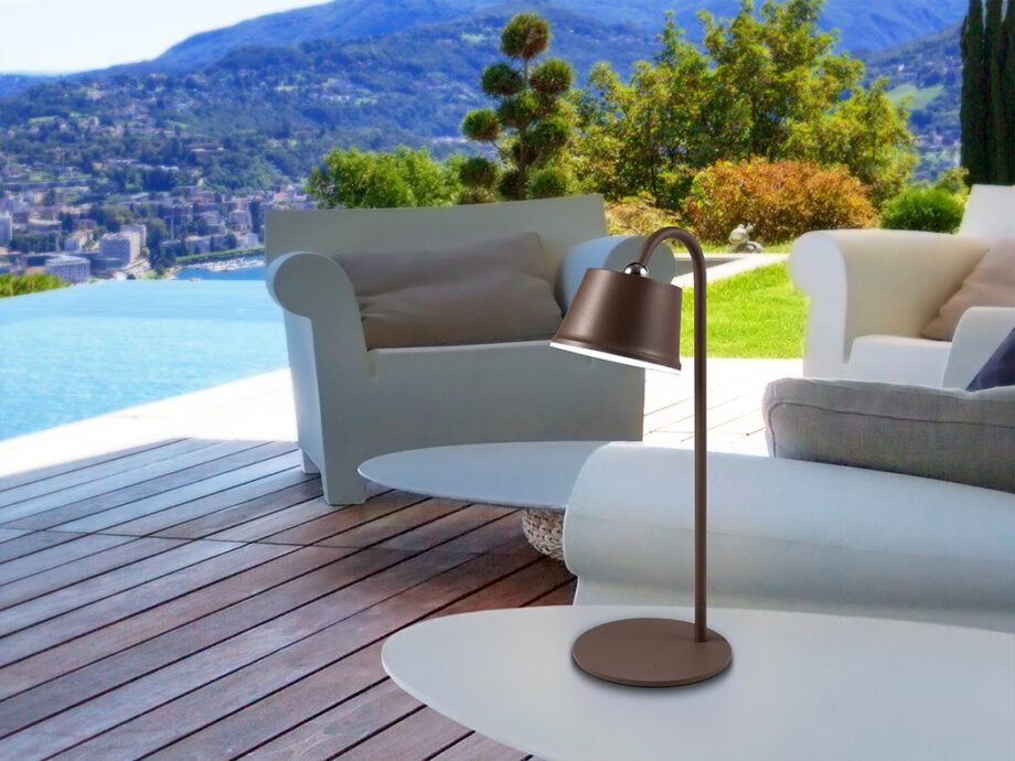 CUCO: Lámpara sobremesa Led corten, batería recargable 3W y accesorios, Ip54, 498214 Schuller. STOCK EN TIENDA