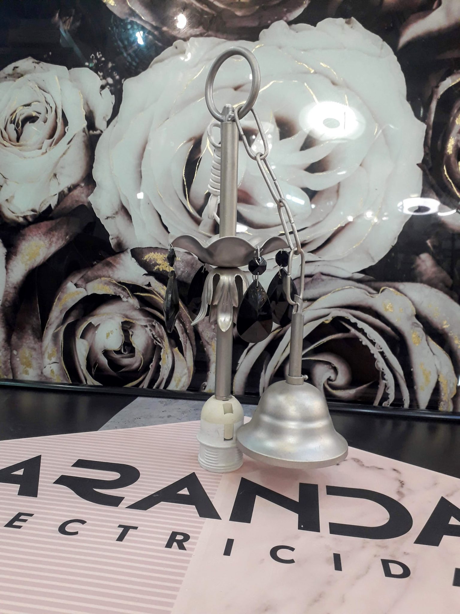 Enfilaje con cadena Iridio con cristales negros, Mercalámpara. Para E27 sin pantalla. STOCK EN TIENDA