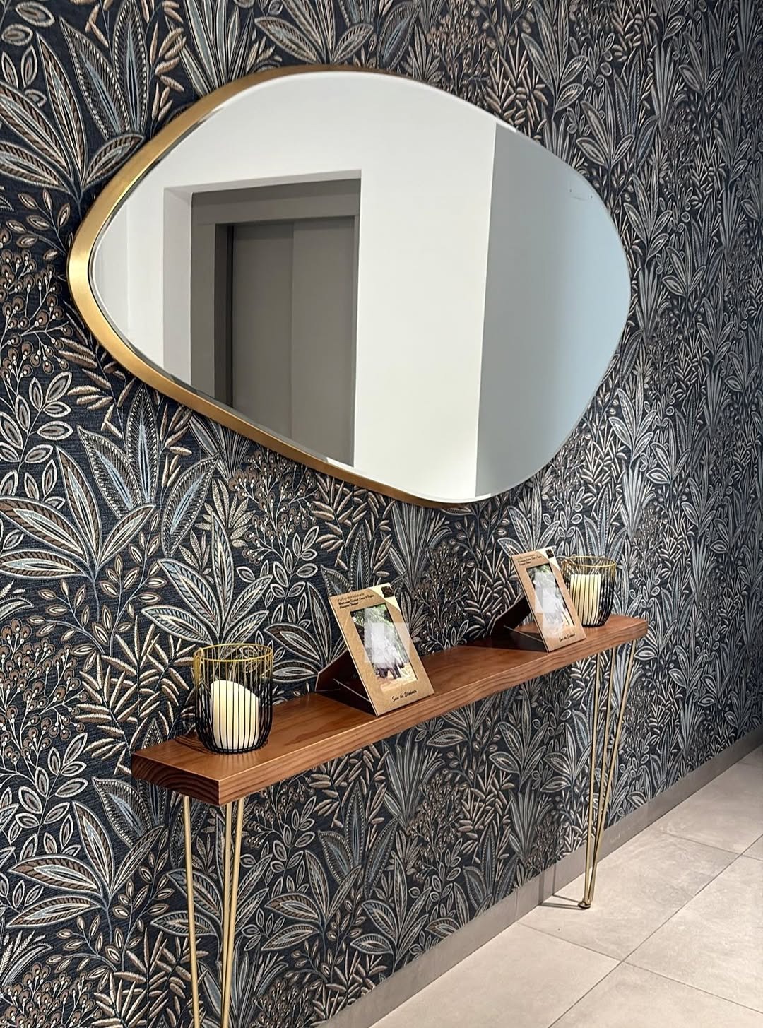 Espejo con forma de óvalo irregular, con marco de DM acabado en PAN DE ORO y luna biselada.