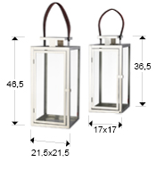 Conjunto de dos faroles para velas, realizados en acero inoxidable y cristal. Asa realizada en piel sintética de color marrón. Velas no incluidas.
