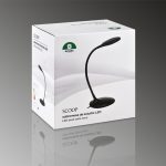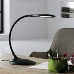 Lámpara sobremesa de estudio LED, realizada en plástico color negro mate. Brazo flexible. Intensidad regulable con pulsador táctil.