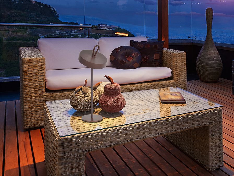 GONG: Lámpara sobremesa Led corten, batería recargable 3W dimable, Ip54, 551821 Schuller.