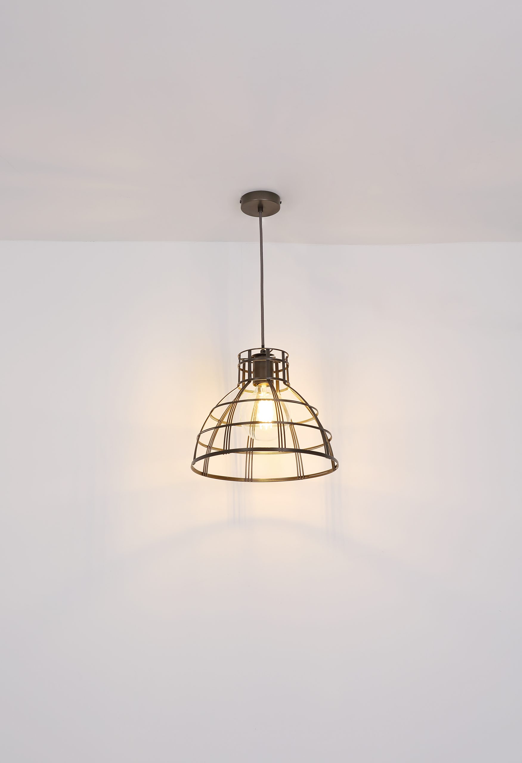 La lámpara de suspensión (F: 35cm, H: 120cm) de la serie GRAMMY impresiona con una combinación de elementos modernos y un aspecto antiguo de una pantalla de jaula gris.