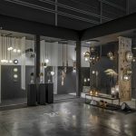 Lámpara colgante de un ejemplar diseño futurista y agrupable.