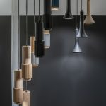 Lámpara colgante de un ejemplar diseño futurista y agrupable.