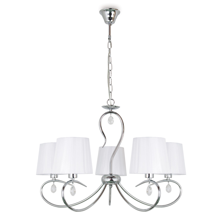 Lámpara metálica cinco brazos cromo, con pantalla hades blanca 15 cm, y detalle de lágrima de cristal bajo portalámparas.