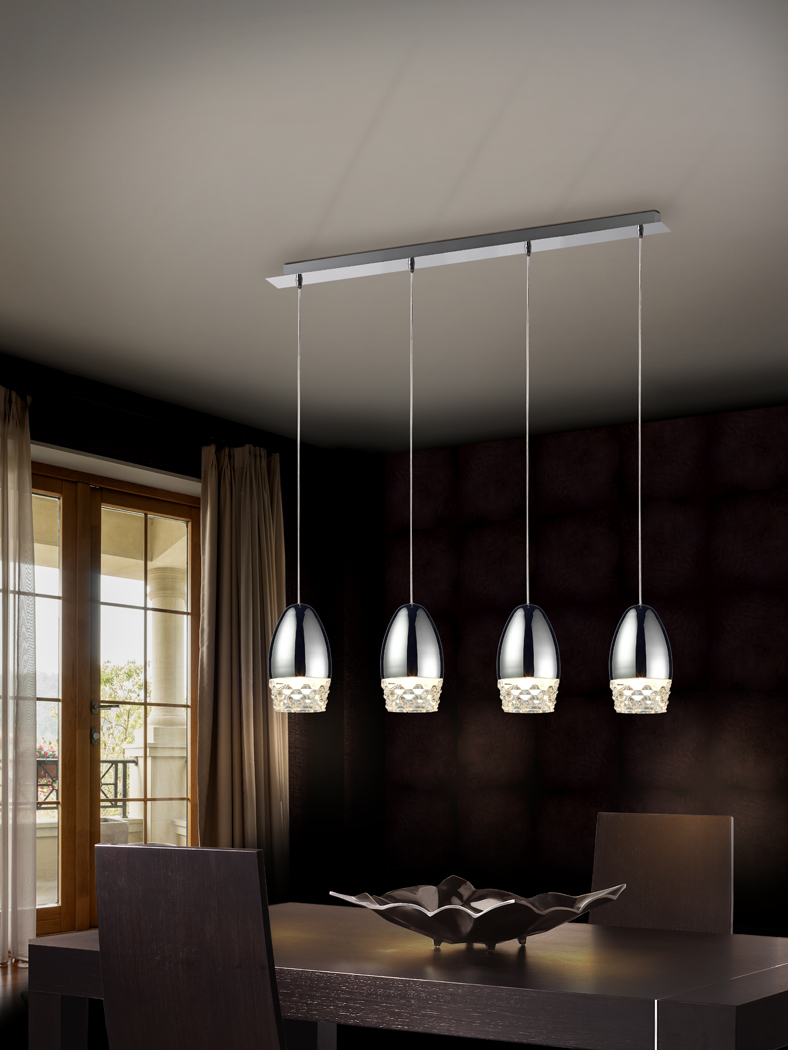 Lámpara lineal de 4 luces, realizada en metal acabado cromo, con tulipa de cristal moldeado y regulable en altura con cable transparente.