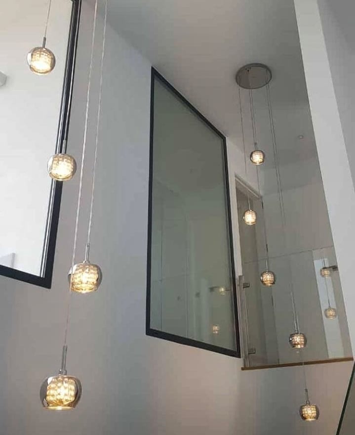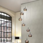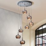 Lampara de techo suspendida de 7 luces, realizada en acero acabado brillo.