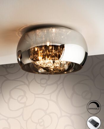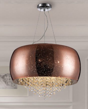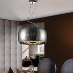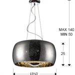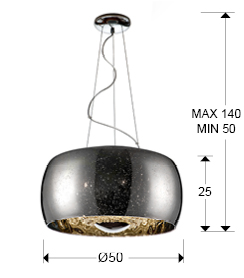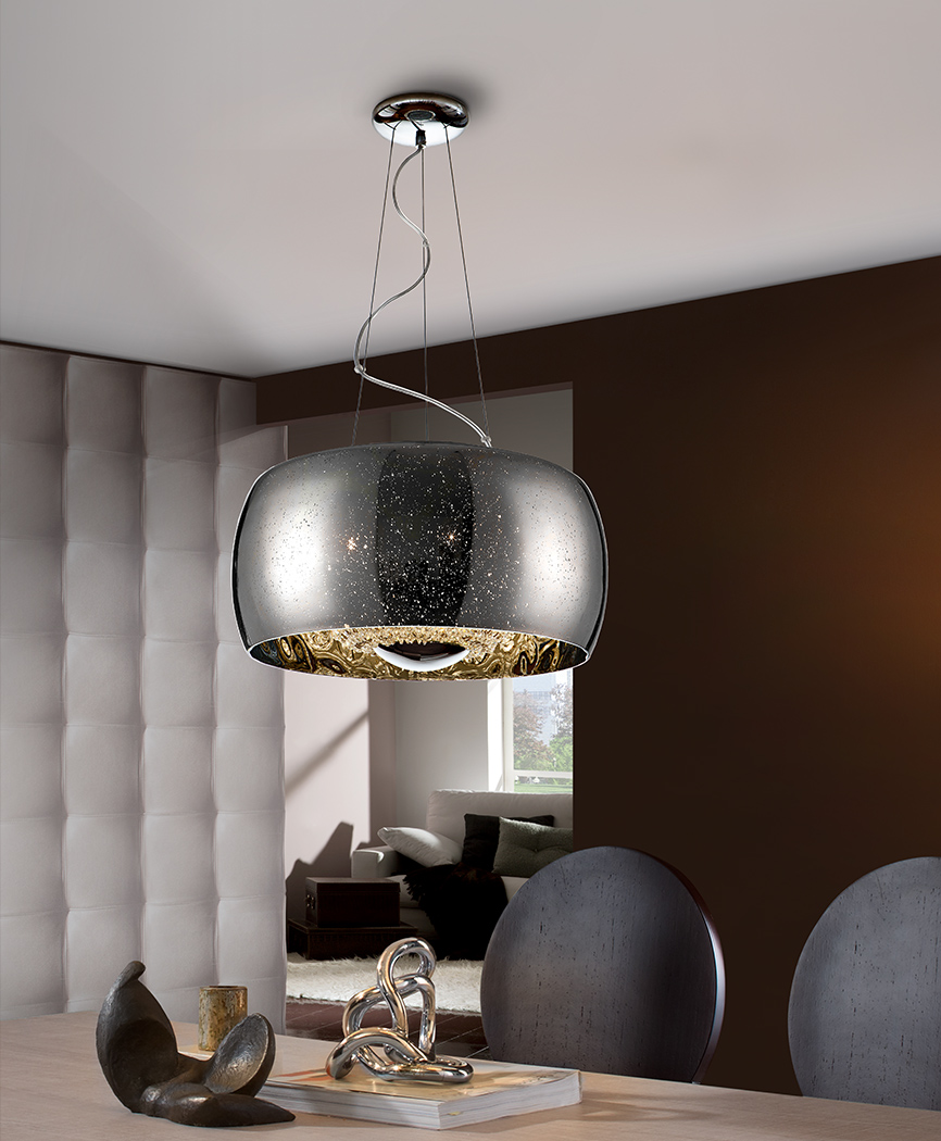 Lámpara de 6 luces realizada en metal acabado cromo. Tulipa de cristal soplado en color plata espejado. Decoración efecto estrellado. Esfera interior formada por cadenas de cristales facetados.