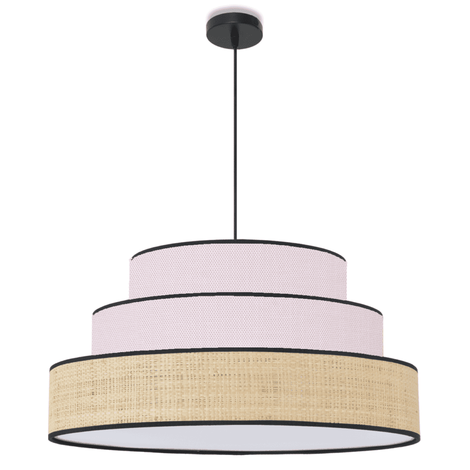 Colgante de tres cuerpos dos en tela Neptuno rosa  y una en Caña, material imitación a rejilla, con vivo negro.