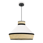 Colgante de tres volúmenes con tela Neptuno beige central  y dos en Caña, material imitación a rejilla, con vivo negro.