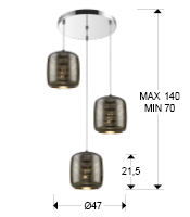 Lámpara de 3 luces realizada en metal acabado cromo. Tulipas de cristal espejado con patrón de lineas transparentes. Cable transparente