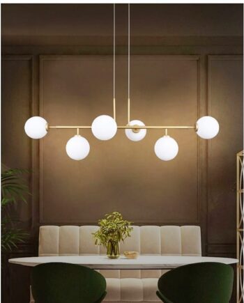 Lámpara compuesta por nueve esferas cristal opal blancas.