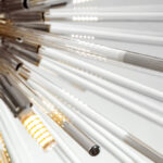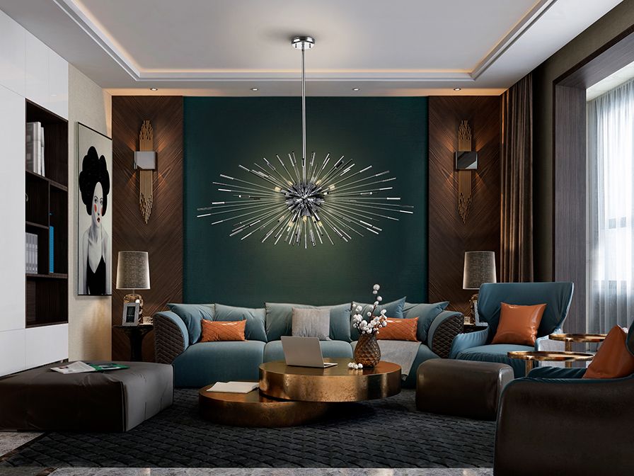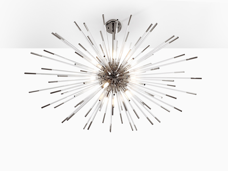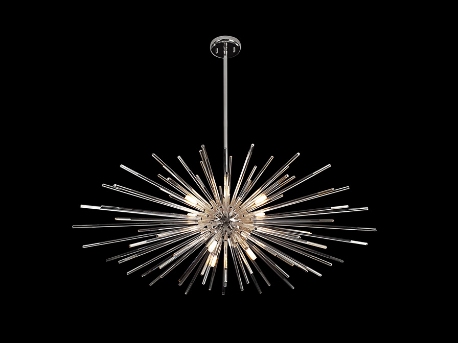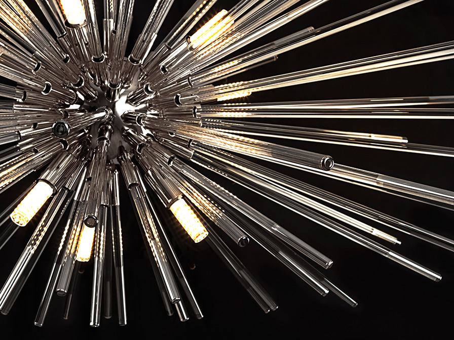 Las varillas de vidrio reflejan bellamente la luz de las nueve bombillas G9 y ofrecen una pantalla de luz interesante.