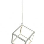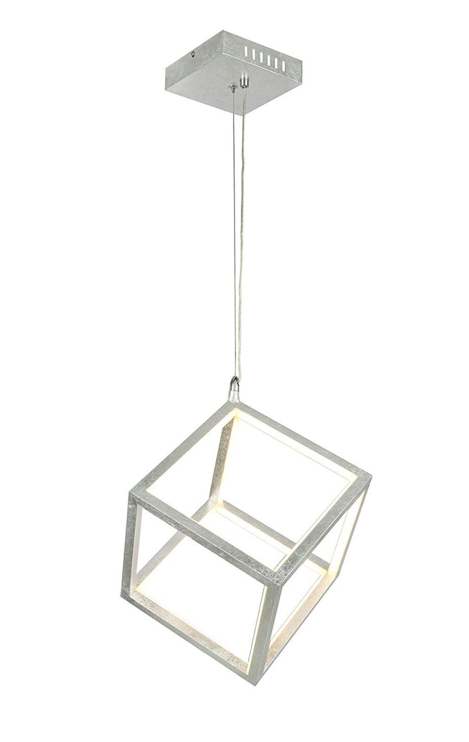 Lámpara colgante acabado en pan de plata con Led incluido cálido de forma cubo geométrico.