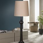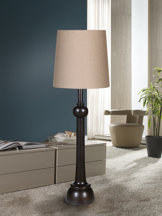 Lámpara de pie realizada en madera, acabado pintura negro anticuario. Pantalla textil de color beige.