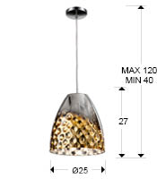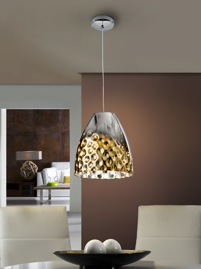 Lámpara realizada en metal acabado cromo. Tulipa de cristal soplado haciendo ondas en color espejado difuminado a dorado.