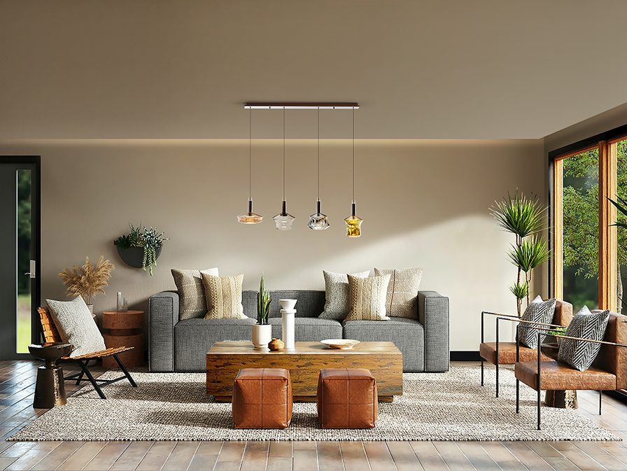 Lámpara SCARLETT bronce oscuro en línea de 4 colgantes colores con 24W Led Schuller